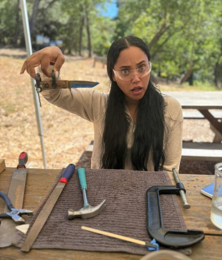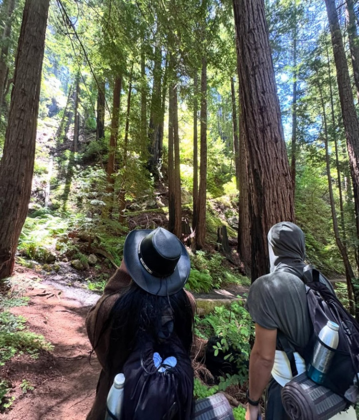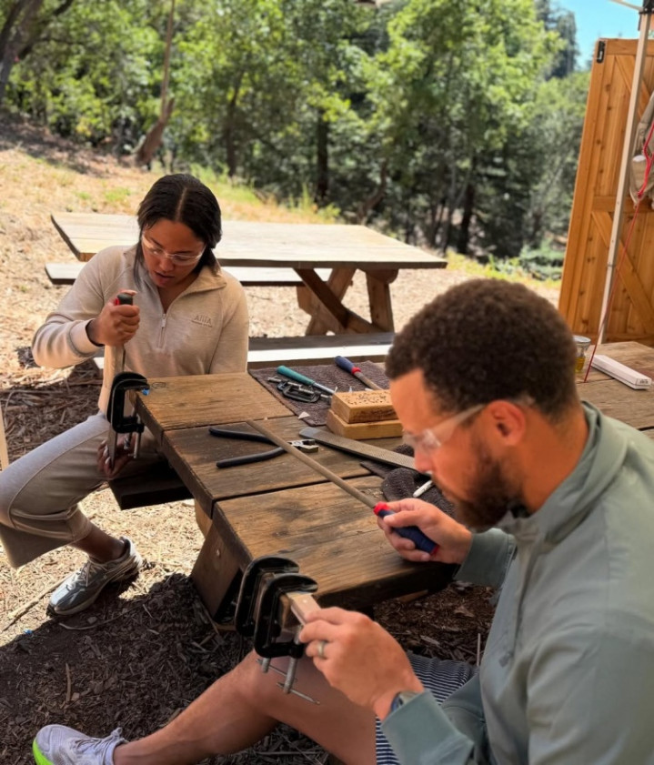 照片中两人置身山野进行木工活,还在山泉中嬉戏。配文写道:“永恒与超越。”