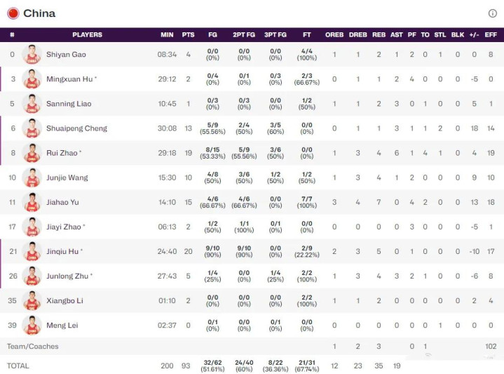 赵睿队长担当,屡救球队于危难,作为中国队关键人物,开局不利时他率先发力连得5分,为球队止血,而且上半场三分表现不错,是中国队能够顶住沙特反扑、守住胜局的最大保障,整场贡献19分。