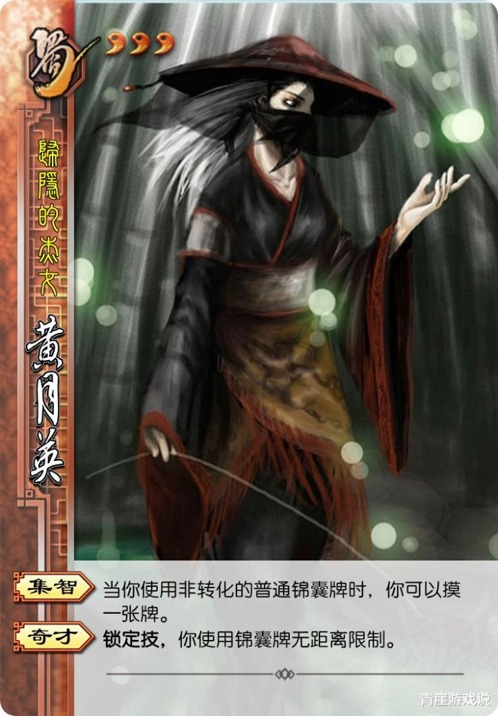 黄月英是蜀国的概念神,【集智】使用锦囊后就能摸一张牌,搭配上【奇才】用锦囊没有距离限制。用一张锦囊摸一张锦囊,这就是黄月英的过牌方式。