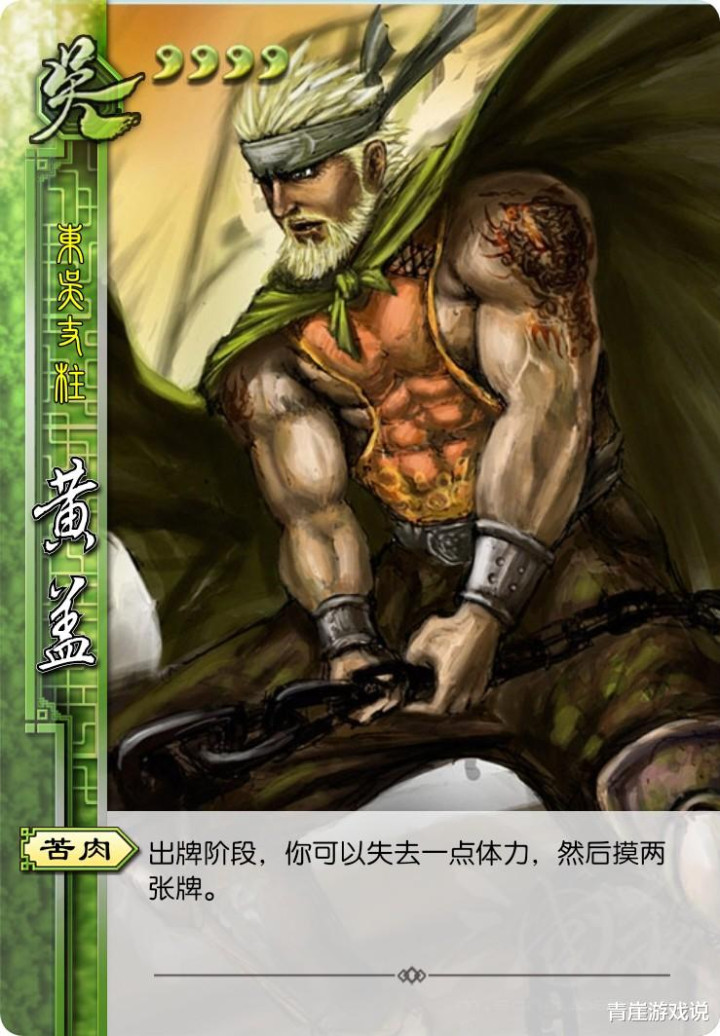 黄盖是唯一一位传说级武将,概念神在他身上就是真神!【苦肉】用一点血量换两张牌,理论上血量够高,黄盖就能实现无限刷牌!