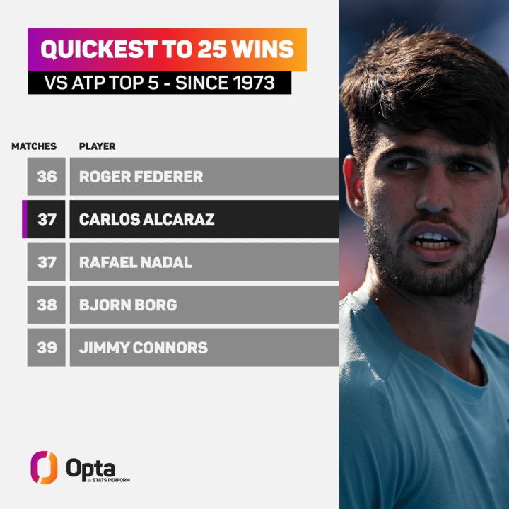 自1973年ATP排名系统创立以来,仅费德勒(36场)比阿尔卡拉斯(37场)以更少的场次达成对世界前五25胜。