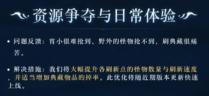 策划承认,低估了大家的热情,导致怪物数量严重不足。所以,承诺会大幅提升各刷新点的怪物数量和刷新速度,并适当增加典藏物品的掉率。