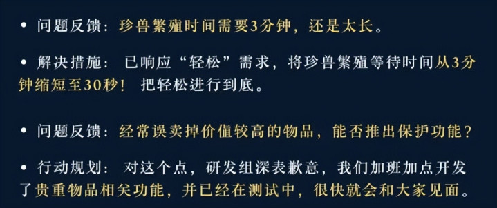 交易行预购可以取消了(已在开发);珍兽繁殖时间从3分钟缩短到了30秒;内置语音也提上了开发日程;甚至连误卖贵重物品的问题,都开发了保护功能。
