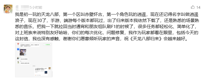 有位老哥说:“我是初一玩的天龙八部……现在30了……你们的每次优化,问题修复,我作为玩家都看在眼里,包括今天的这封信,我也深有感触,谢谢你们愿意倾听玩家的声音。祝《天龙八部归来》会越来越好。”