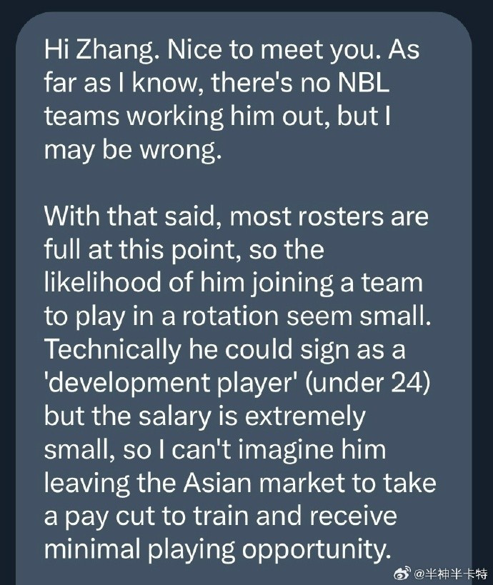 @半神半卡特在个人微博上写道:“和澳大利亚媒体聊了一下林葳的情况,对方说暂时没有他去NBL球队试训的消息,而且目前阶段大部分球队名单都满了,机会不多。如果以‘发展球员’身份加入,薪资极低,他说很难想象林葳能有如此魄力放弃高薪、从零开始。”