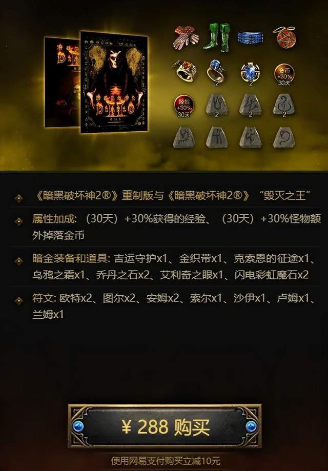 档位二:贵宾体验卡。玩家支付288元,获得档位一内容外,还可以获得30天的经验和金币掉落加成服务。暴雪还附赠了一系列经典暗金,如乔丹之石、金织带,艾利奇之眼等。作为暗黑2最经典和最核心的“符文”内容,同样是附赠了些许。