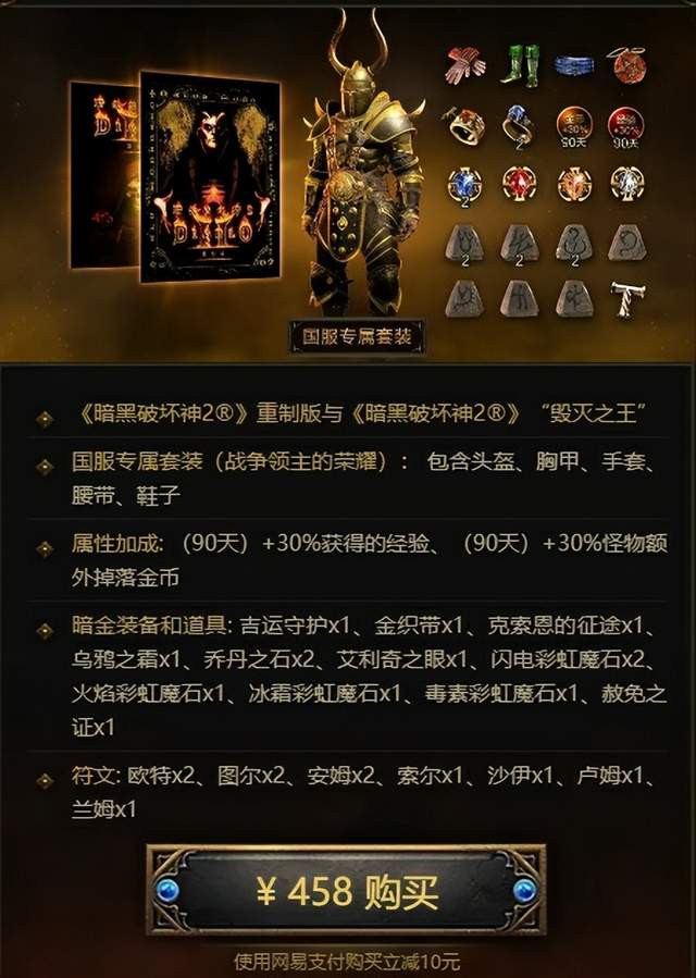 档位三:忠实粉丝卡。玩家支付458元,在档位二的基础上,经验和金币加成延长到90天,还有一套专属套装(战争领主的荣耀)。此外赠送的暗金还多了几个暗金宝珠,让玩家提前享受到更多装备镶嵌的快乐。