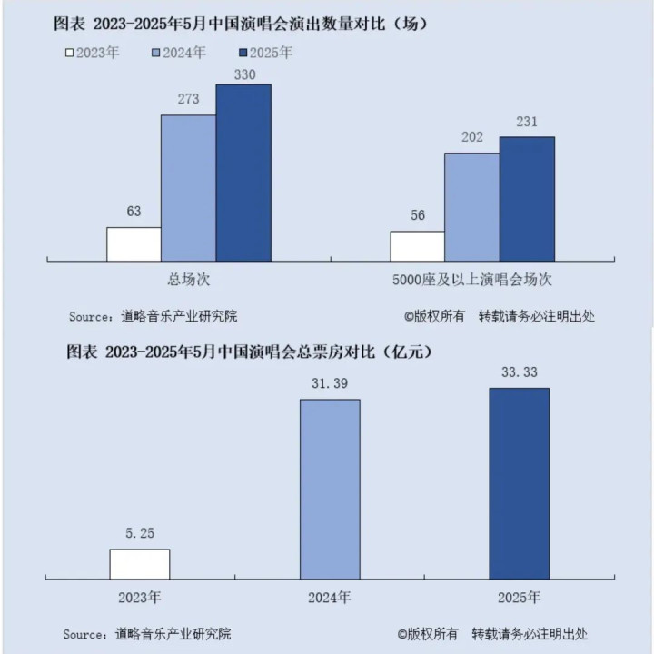 据道略音乐发布的演唱会数据,今年5月,演唱会市场进入演出旺季,演唱会演出总场次达330场,与2023年5月的63场相比,增长幅度高达423.8%;与2024年5月的273场相比,也同比增长了20.9%。但从票房维度看,今年5月的票房总收入为33.33亿元,同比去年仅增长6.2%,远低于场次增长幅度,这意味着单场票房正在走低。