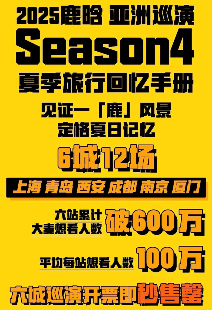 数据也显示,截至8月5日,鹿晗四巡上海、青岛、西安、成都、南京、厦门6站大麦累计想看人数破600万,平均每站想看人数破百万,开票即秒售罄,评分高达9.9分,口碑一骑绝尘;演唱会也让经典歌曲数据攀升,《我们的明天》《勋章》《致爱Your Song》等歌曲登上榜单前列;各个平台热度高居不下,全网热搜800+,主话题阅读量超24亿,相关话题阅读量破百亿、讨论量1400万、互动量4400万,几乎每站都是现象级刷屏。