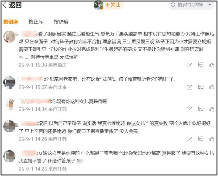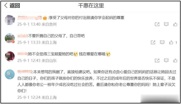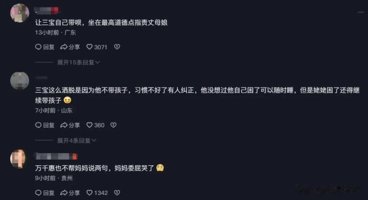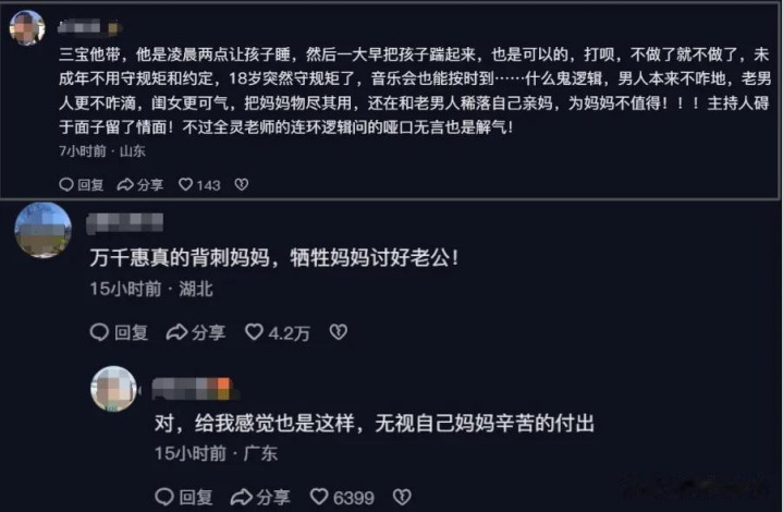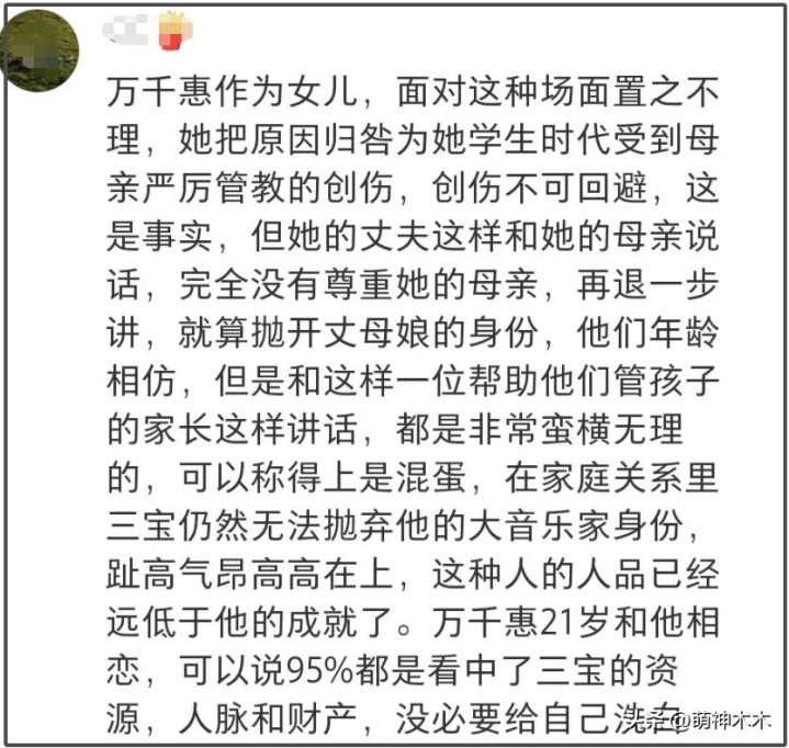 对于三宝,网友主要质疑他不尊重万千惠妈妈,而对于万千惠,网友更多是替万千惠妈妈觉得心寒,痛批万千惠白眼狼,甚至有网友直言,给万千惠当妈妈好倒霉。