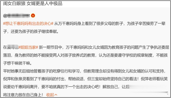 万千惠如果不认可自己妈妈的教育理念,完全可以不让亲妈带孩子,既然让人家插手了,那就别光在嘴上尊重妈妈付出,丈夫和妈妈有了观念冲突,万千惠但凡有一点为亲妈考虑,就应该及时出面缓解矛盾,而不是在一边看热闹,还有点乐见于妈妈被丈夫挤兑,给人一种为了讨好老公,委屈亲妈的感觉。