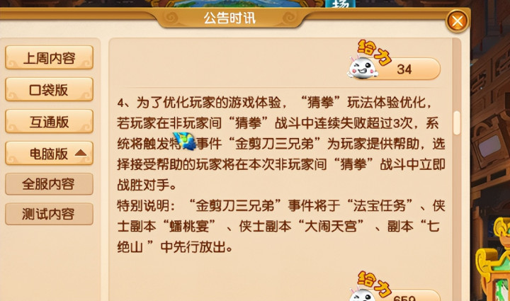 2、猜拳优化,在副本蟠桃宴、大闹天宫、七绝山以及法宝任务中放出。