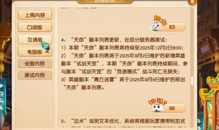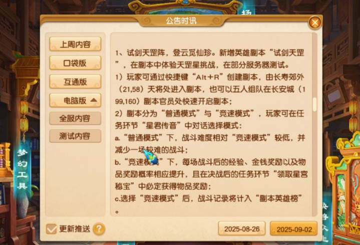 5、天命副本列表更新,新的试剑天罡加入进去,替换掉青丘迷雾。