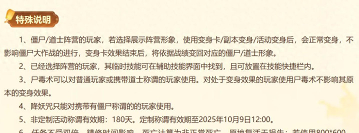 特别说明的是变身僵尸以后不会影响正常的副本变身,该怎么变就怎么变。如果不想被变成僵尸,可以先去NPC领一个护身符,能顶一天。