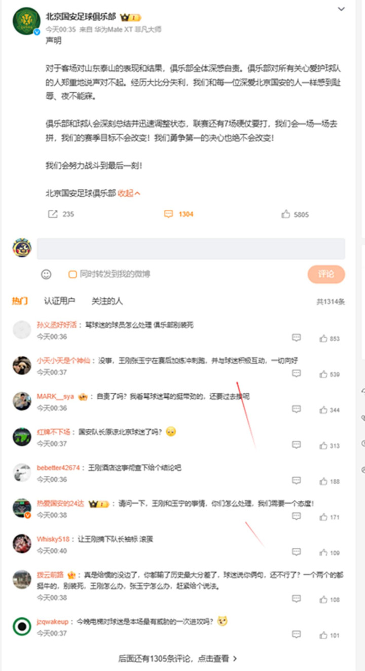 事情发生之后,国安足球俱乐部也发了声明,按照声明来看,由于对山东泰安的表现和结果,俱乐部感到很抱歉,很自责,对于那些关心爱护球队的人,郑重的说一句,对不起。