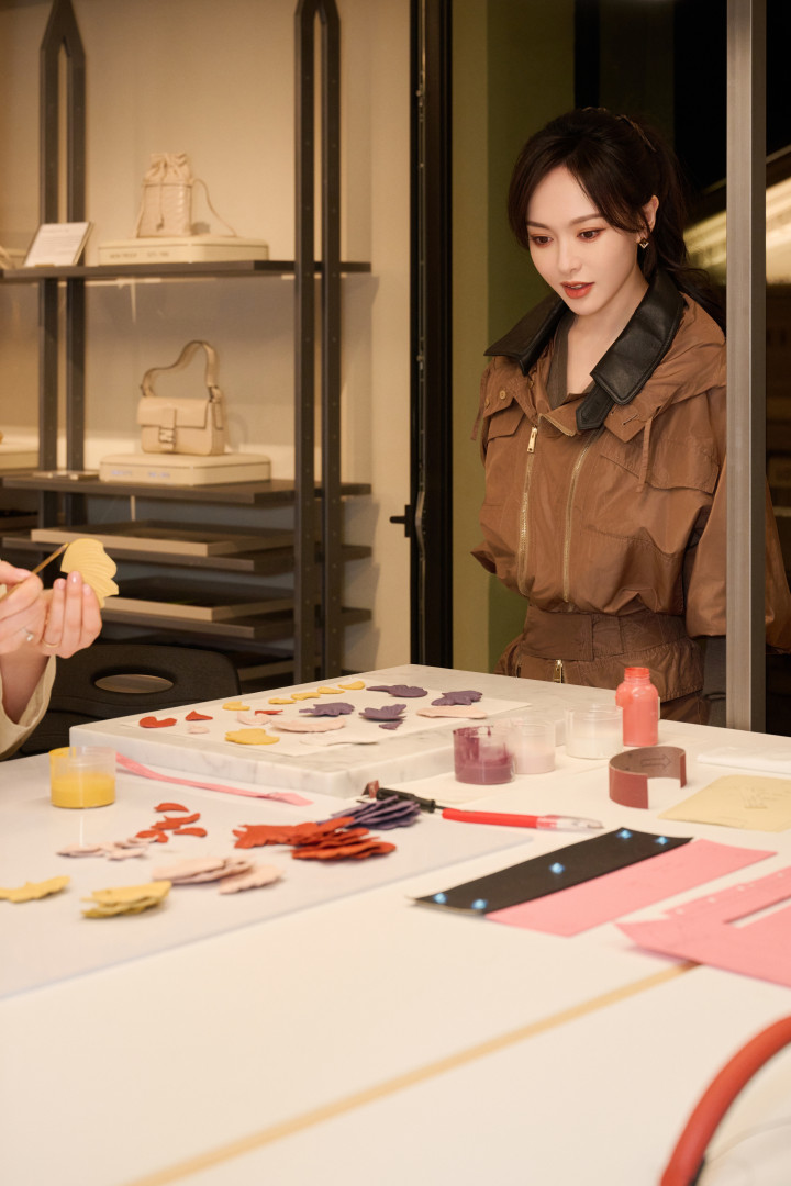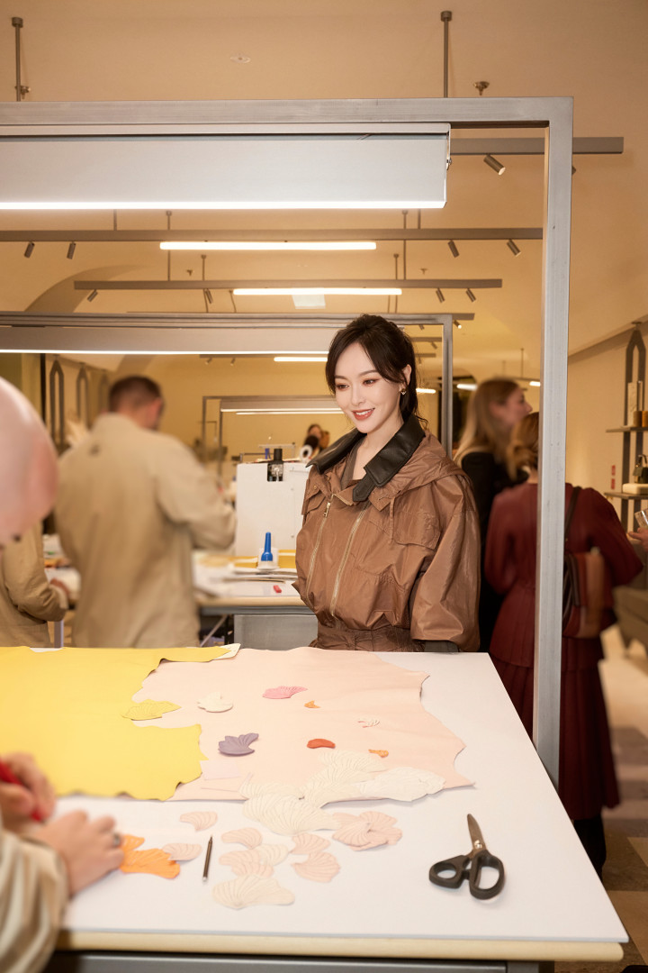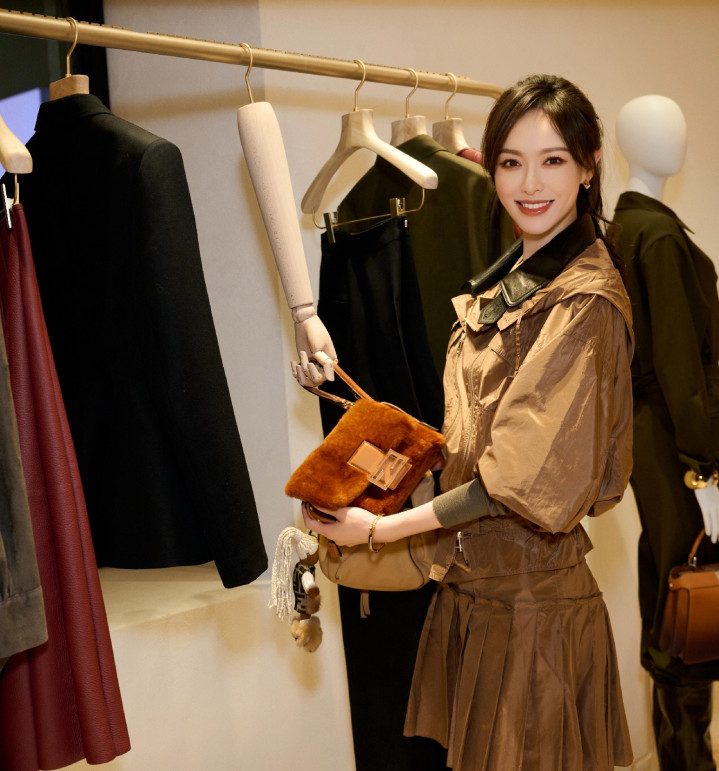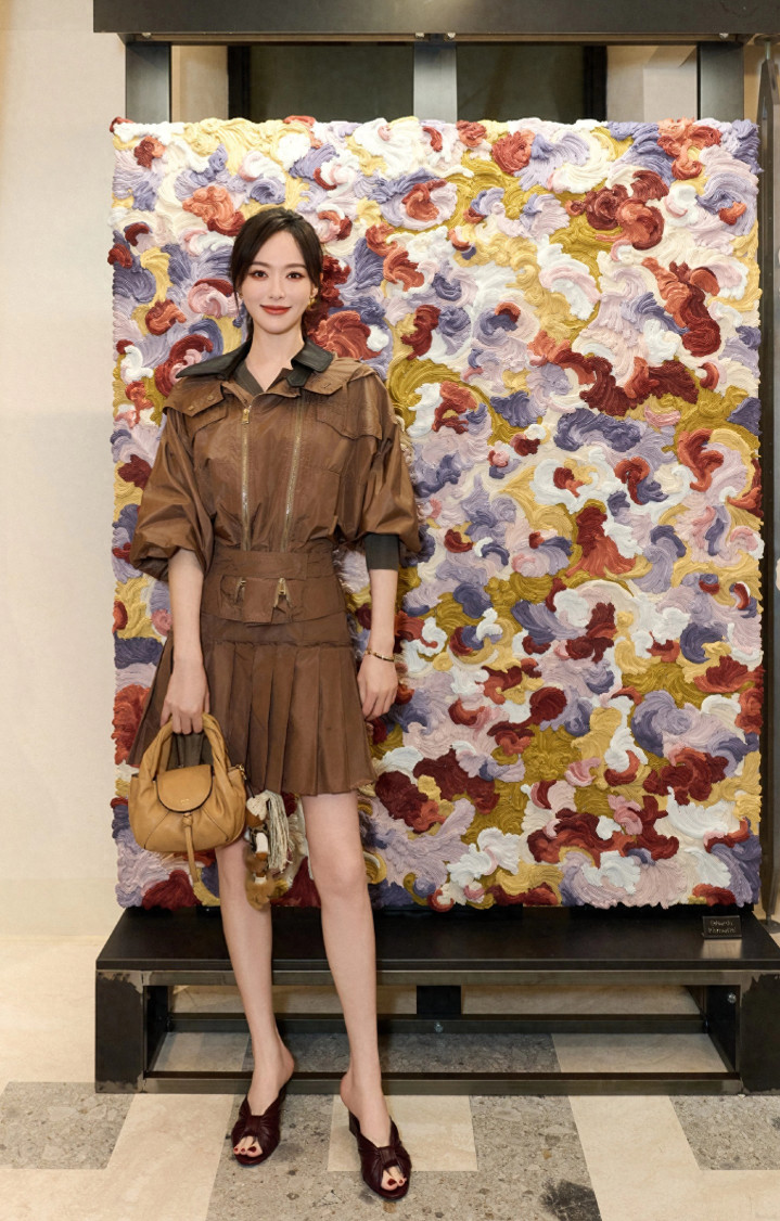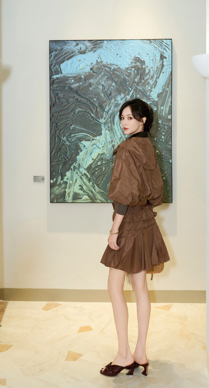 唐嫣米兰新造型, 身穿棕色短裙套装, 双腿修长, 身材高挑