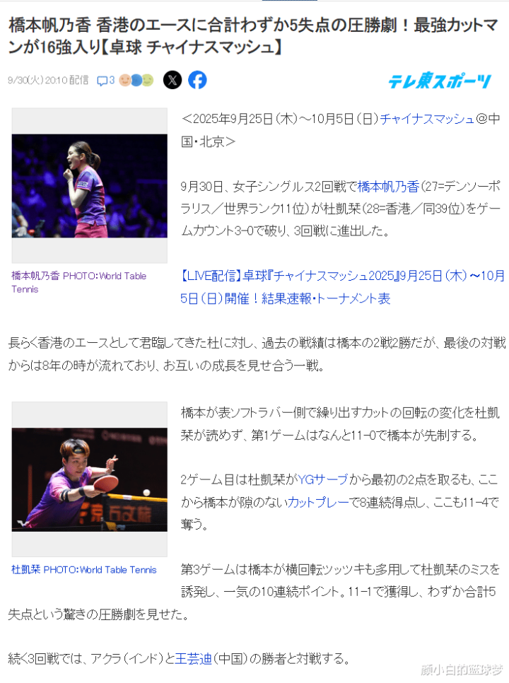 日本媒体《东京体育新闻》写道:桥本帆乃香只让中国香港王牌杜凯琹三局拿5分,这是压倒性的胜利,她是我们的最强理发师。
