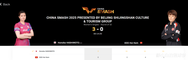北京时间9月30日,WTT北京大满贯女单1/16决赛,桥本帆乃香3-0横扫杜凯琹,三局比分:11-0、11-4、11-1。对,你们没有看错,杜凯琹三局只得到5分,而且第一局挂零,桥本帆乃香是将杜凯琹打得满地找牙。