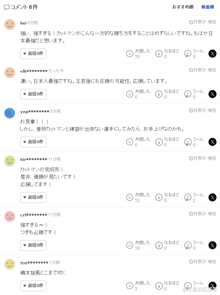 看看日本球迷的呼声:1.强,太强了,桥本选手如同理发师一样直接剃了对方光头,我觉得桥本帆乃香是日本最强;