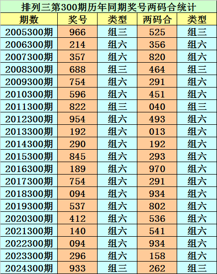 排列三从2004年开奖至今已开出7423期奖号了,其中第300期历史同期奖号出现20次,历年第300期分别开出号码:966、214、357、688、754、596、822、954、192、290、845、189、754、094、537、412、140、094、296、933。