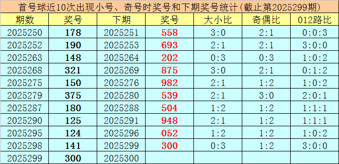 在首号球前10次开出小 号、奇号类型之后,其下期分别开出奖号:558、693、202、875、982、539、504、948、052、300,其中号码奇偶比为6:4,大小比为7:3,012路比为5:0:5。
