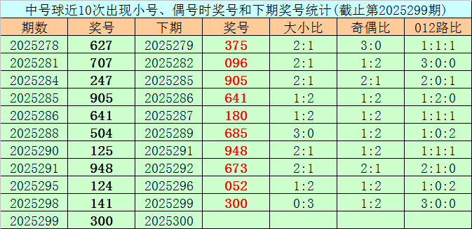 在中号球前10次开出小 号、偶号类型之后,其下期分别开出奖号:375、096、905、641、180、685、948、673、052、300,其中号码奇偶比为4:6,大小比为6:4,012路比为3:4:3。