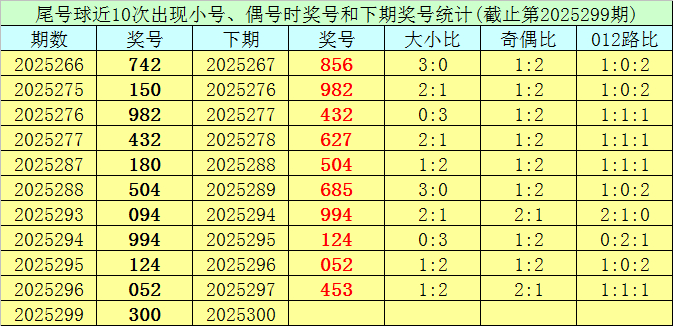 在尾号球前10次开出小 号、偶号类型之后,其下期分别开出奖号:856、982、432、627、504、685、994、124、052、453,其中号码012路比为2:4:4,奇偶比为3:7,大小比为3:7。
