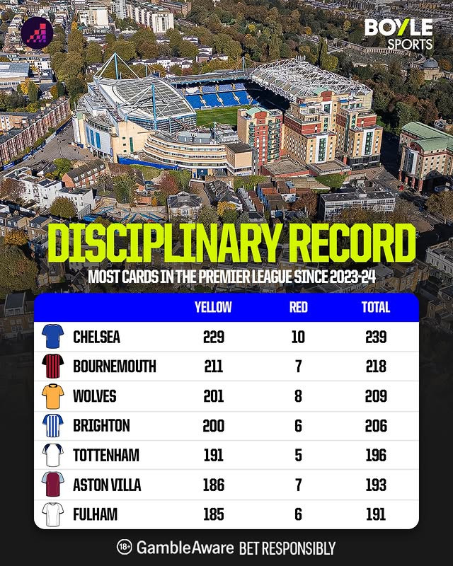虎扑12月01日讯Opta数据统计,盘点自2023/24赛季以来英超球队红黄牌榜,其中切尔西共拿到239张牌排名第一。