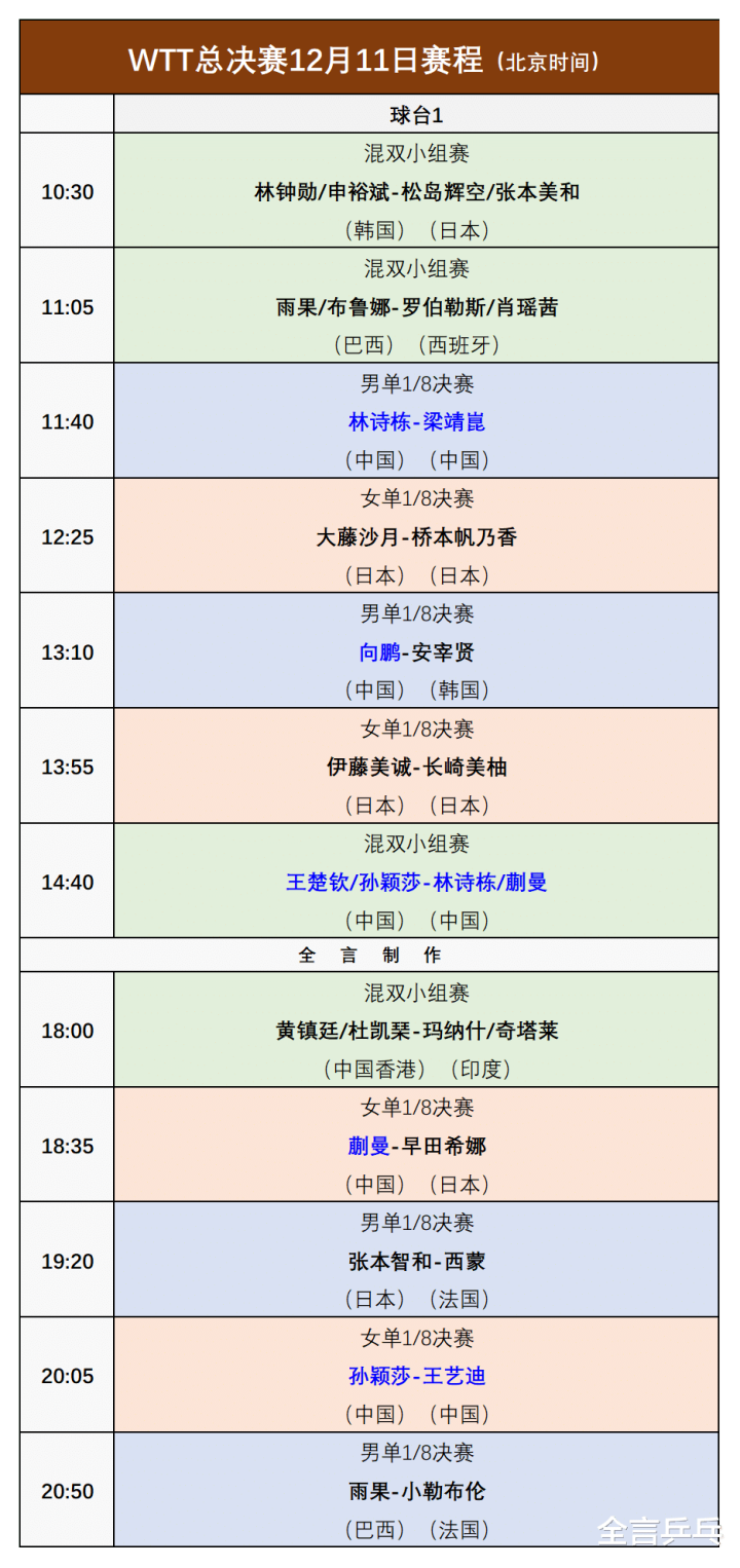 12月11日晚,单打将结束首轮对决,混双也将结束第二轮的较量,具体赛程如下:
