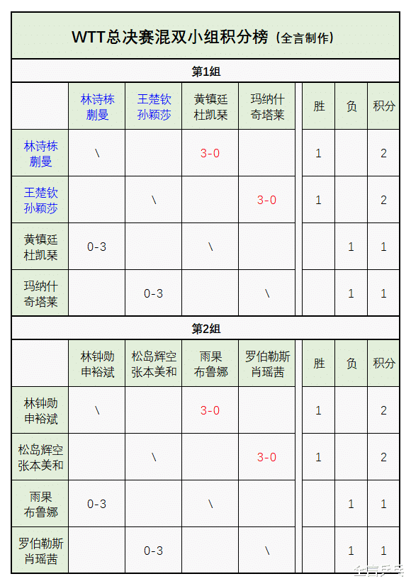 混双:松岛辉空/张本美和(日本)3-0罗伯勒斯/肖瑶茜(西班牙)、林钟勋/申裕斌(韩国)3-0雨果/布鲁娜(巴西)。
