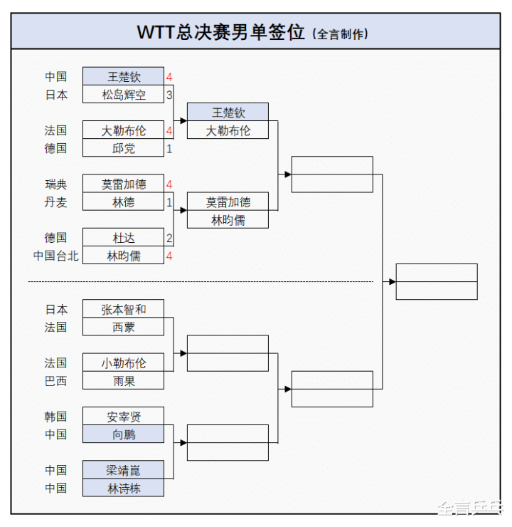 男单:林昀儒(中国台北)4-2杜达(德国)、大勒布伦(法国)4-1邱党(德国)、莫雷加德(瑞典)4-1林德(丹麦);