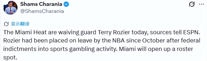 热火理论上仍希望能收回部分罗齐尔2660万美元的薪水——这取决于他的司法案件最终如何裁决。但鉴于他的合同即将到期,且几乎不可能在附加赛为热火出战,继续留他在名单内已无意义。
