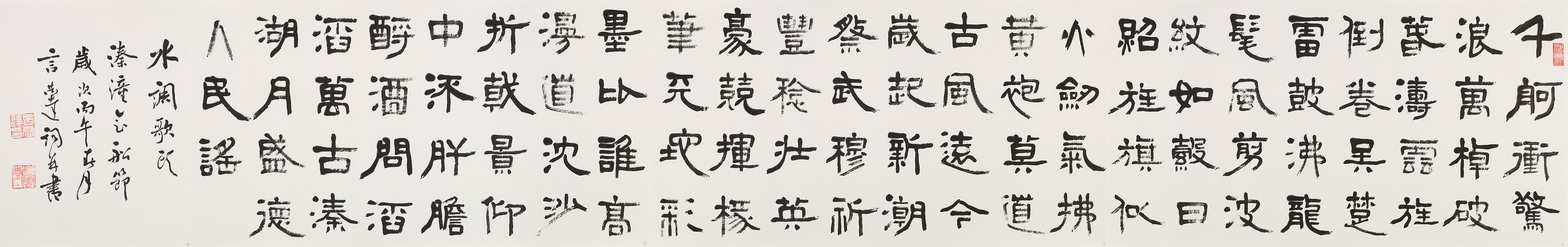 如果说《水调歌头·溱潼会船节》是一篇精妙的剧本,那么,6.5米汉隶长卷,则将剧本演绎成引人入胜的盛大场景。先生自书自诗,情与笔融,墨与心合,将词中浩气跃然于笔墨之间。这幅长卷,绝非简单的文字书写,而是与词作意境高度契合的艺术再创作,每一笔、每一划,都藏着对词文的理解,对民俗的敬畏。