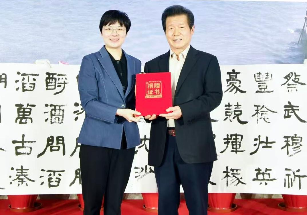 (图为姜堰区委书记孙靓靓为言恭达先生颁发收藏证书)