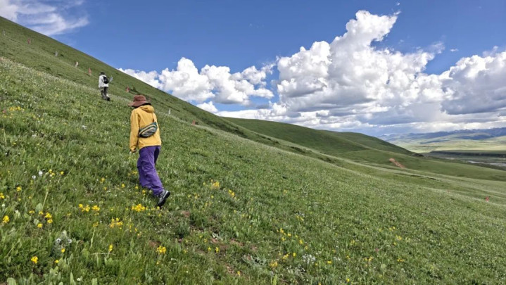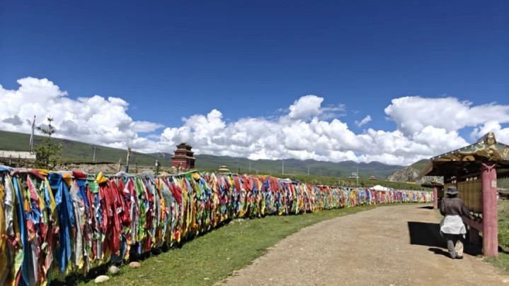 之后前往一个近千年的古寺,穿过青稞田野,脚下的土地,开满花朵,眼光随着远处的青山攀上高峰,上面是云朵和蓝天