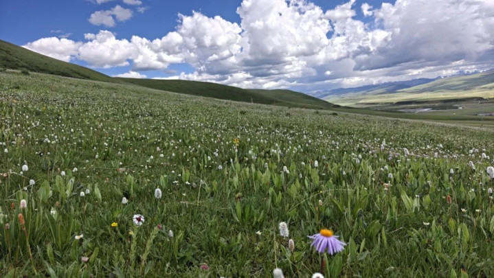 沿着鲜水河,沿着G227,这是中国熊猫大道,在龙灯草原停下来,我们没有去游人扎堆的停车场、服务区,我们在山坡上,看野花、牛马和流水,这是格萨尔王的大将撒骨灰的地方第一次看到许多擦擦房