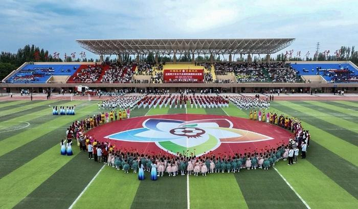 开幕式后,全体人员共同观看了精彩纷呈的文艺演出。喀什地区歌舞剧团以开场舞《中华民族一家亲》展现我国各民族团结奋进的精神风貌;喀什市春蕾合唱团近百名春蕾女童合唱《花开中国》,用稚嫩的童声唱出了与党同心同行,与祖国共奋进的心声;喀什地区中、小学生带来的足球主题舞蹈《青春绽放》点燃全场激情,韵律操《石榴花开新时代》奏响了民族团结的最美乐章。全体合唱《歌唱祖国》后,新疆对阵贵州的揭幕赛即刻打响。