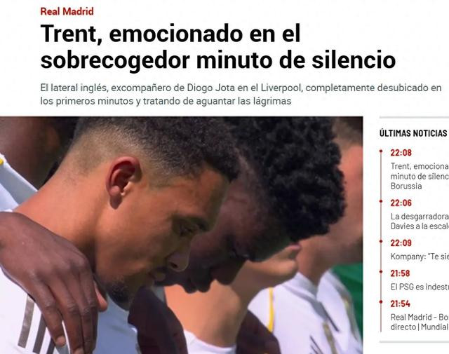 《马卡报》表示:皇马vs多特赛前也进行了令人动容的默哀仪式,镜头聚焦在若塔的前队友阿诺德身上,后者怀着沉重的心情参加这场1/4决赛。镜头中看到,阿诺德的脸上写满了悲痛,他似乎沉溺其中,努力强忍泪水。最后他捂住脸、望向天空,做了最后的祈祷,与若塔和他的兄弟告别。