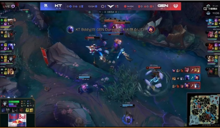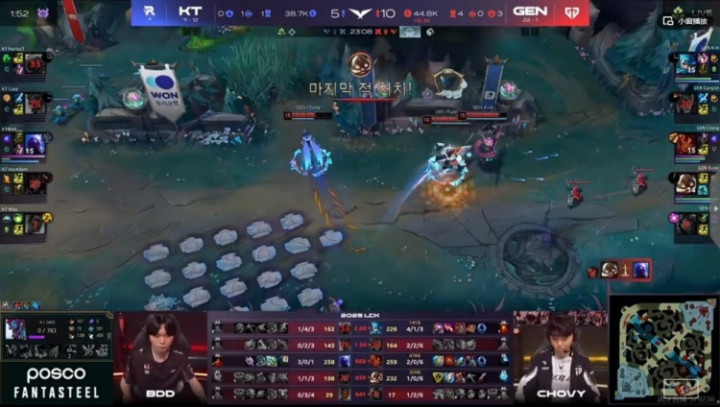 [22:43]小龙团,Bdd瑞兹向前交闪配合队友强杀Duro妮蔻,但是KT一群人堵在了单向车道里被Kiin格温大招AOE打了个爽!最终Chovy岩雀大招封后路留住没闪的Bdd瑞兹,GEN团灭KT,拿下小龙!经济差快7K了!