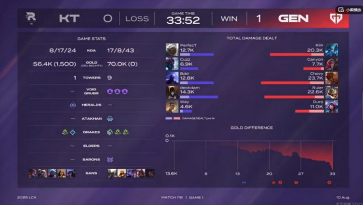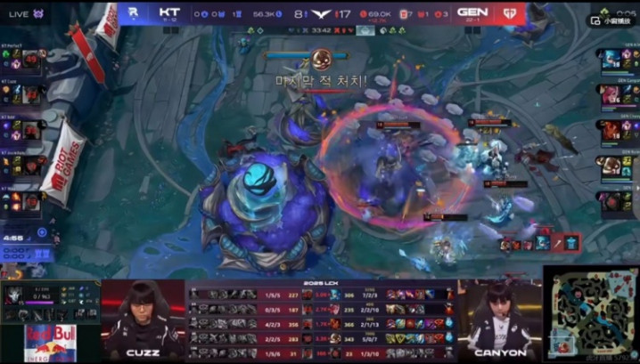 [33:02]大龙刷新,KT还想摸GEN的中一塔,结果被右后方绕后的Duro妮蔻直接坐大到了双C!这俩人先后倒下KT没战力了啊!Canyon蔚带队追上高地,逐个击破GEN完成对KT的团灭,结束首局的比赛!