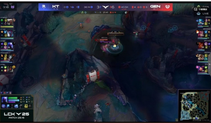 [25:01]GEN上路强行越塔失败,Duro妮蔻空大,Way芮尔绕后成功吸两个留人!Chovy岩雀先倒之后TP落地进场的Kiin格温没闪被KT众人围杀!KT打出0换2想大龙逼团,但是留不住人啊,被Chovy岩雀开大配合队友反杀掉Way芮尔!反而是GEN成功接盘了这条大龙!