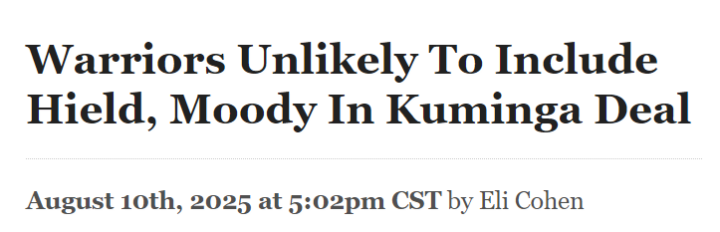 由于劳资协议中关于先签后换的基年补偿规则,任何需要引进更高薪资球员的交易,都可能要求勇士队额外再加入一名球员。但Fischer指出,勇士队将穆迪和希尔德视为下赛季有价值的贡献者。