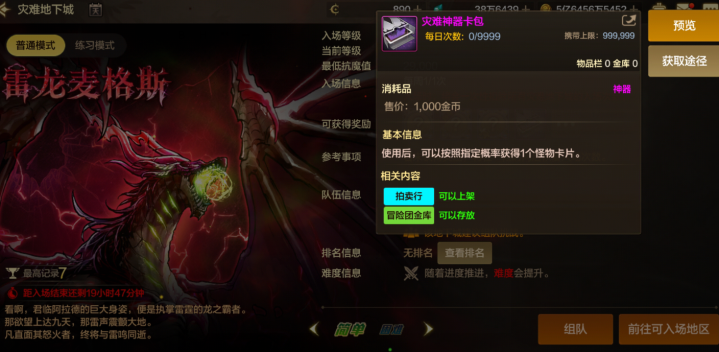另外一个就是雷龙副本的奖励次数也是刷新了,和周本星期三刷新奖励不同,雷龙可是周一刷新奖励次数的。这雷龙的主要奖励还是这个卡包,这可是能开出狂暴雷龙卡片的,这张卡片可是目前的最终毕业卡片价值300多万泰拉。如果大家幸运的开出了这张卡片的话,那么也是可以轻松白嫖到夏日双至尊的。而且这个雷龙的入场门槛也是很低,即使是困难模式也才39000的入场门槛。如今大家随便穿几件70级的史诗粉装都能达到,所以说大家小号千万别忘记刷了,15个号刷就是15次获得夏日双至尊的机会啊。