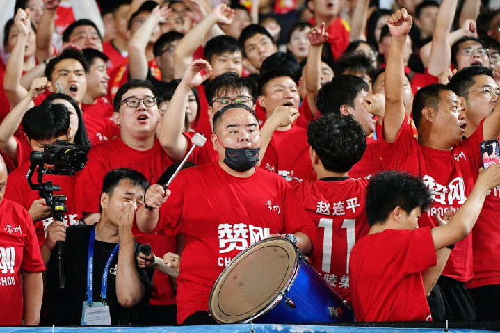 常州球迷协会会长曹戟(中)在主场助威。图/VCG