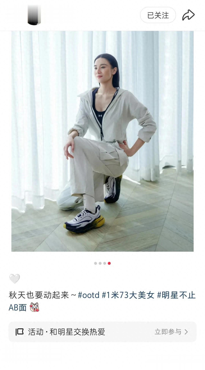 宋佳晒最新美照, 一身米色运动套装身材高挑, 颜值依旧抗打
