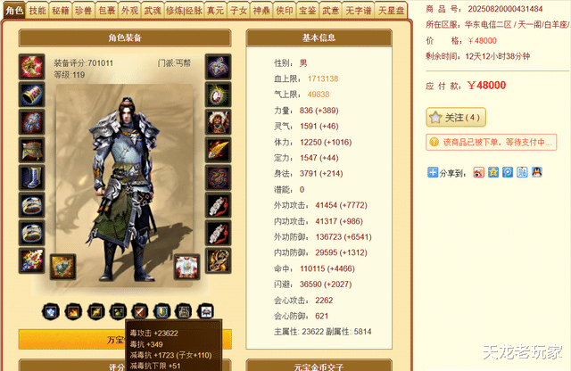 各位老铁,今天给大家介绍的是全服“最便宜的8级号”。来自【天一阁】服务器的70万评分丐帮,目前已经卖掉,成交价仅仅4.8万元!这个价格真的是白菜价了。