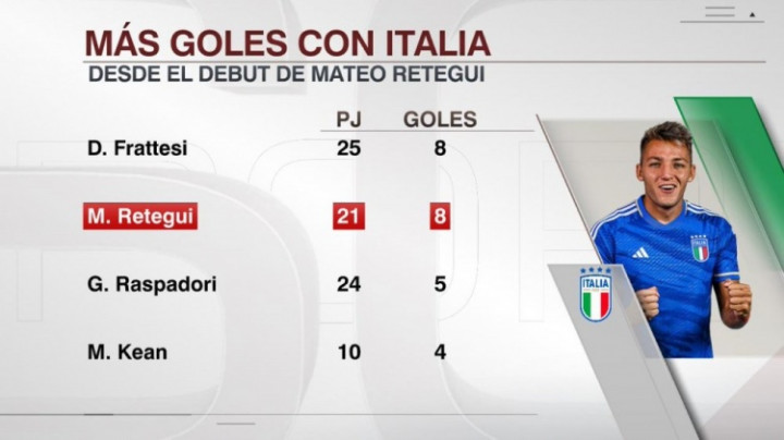 据ESPN统计,雷特吉意大利队首秀以来打进8球,与弗拉泰西并列同期队内进球最多。