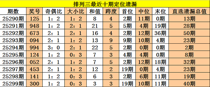 开奖回顾:排列三第2025299期奖号:300,定位直选遗漏值19期、10期、11期,遗漏总值为40期。