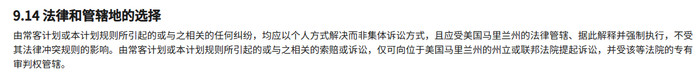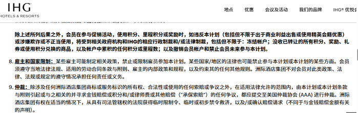 具体来看,万豪的《常客计划细则及条款》明确,由常客计划或本计划规则所引起的或与之相关的任何纠纷,均应以个人方式解决而非集体诉讼方式,且应受美国马里兰州的法律管辖、据此解释并强制执行,不受其法律冲突规则的影响。由常客计划或本计划规则所引起的或与之相关的索赔或诉讼,仅可向位于美国马里兰州的州立或联邦法院提起诉讼,并受该等法院的专有审判权管辖。