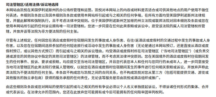 《凯悦细则及条款》指出,本网站由凯悦在美国伊利诺斯州的办公场所管理和运营。本细则及条款以及因本细则及条款或使用本网站所引起或与之相关的任何争端,在所有方面均受美国伊利诺斯州法律规管,并据此解释和强制执行,且不考虑法律冲突规则。由这些细则及条款引起的相关争议必须以个人名义单独提起诉讼,不得诉诸任何形式的集体、合并或代表诉讼。